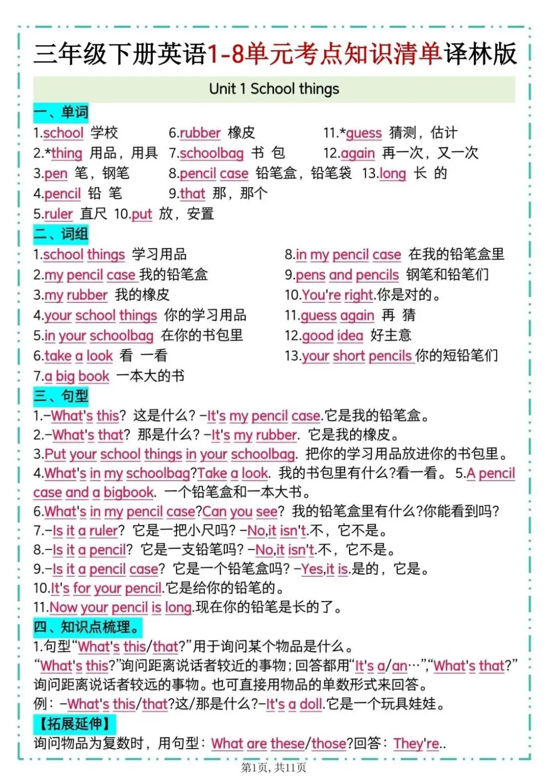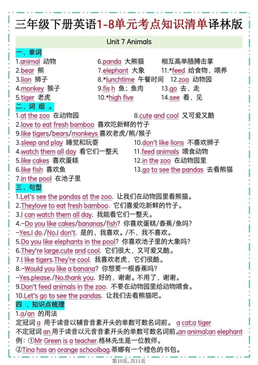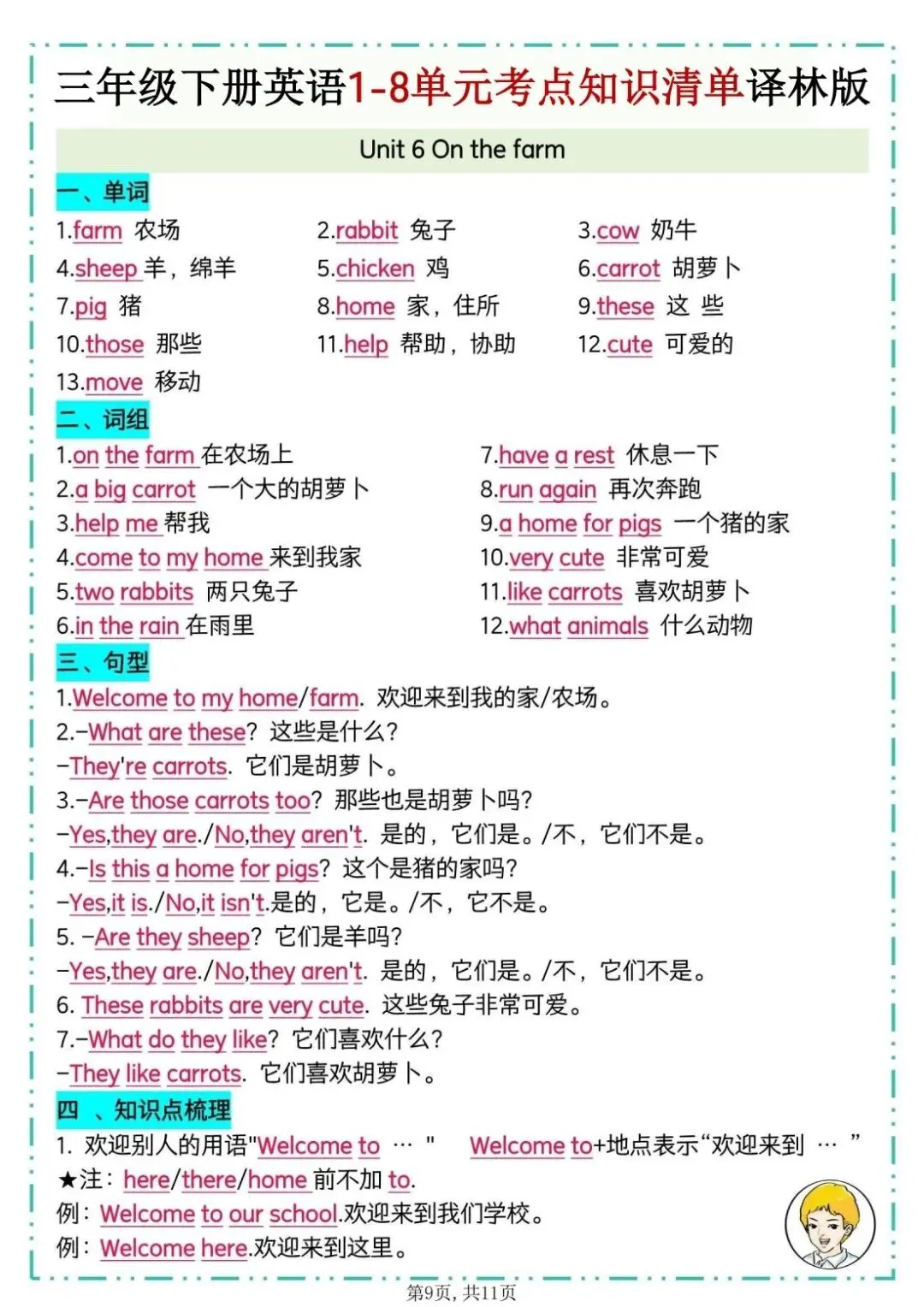 26春译林版三年级下册英语《1-8单元考点知识清单》,共11页,可打印