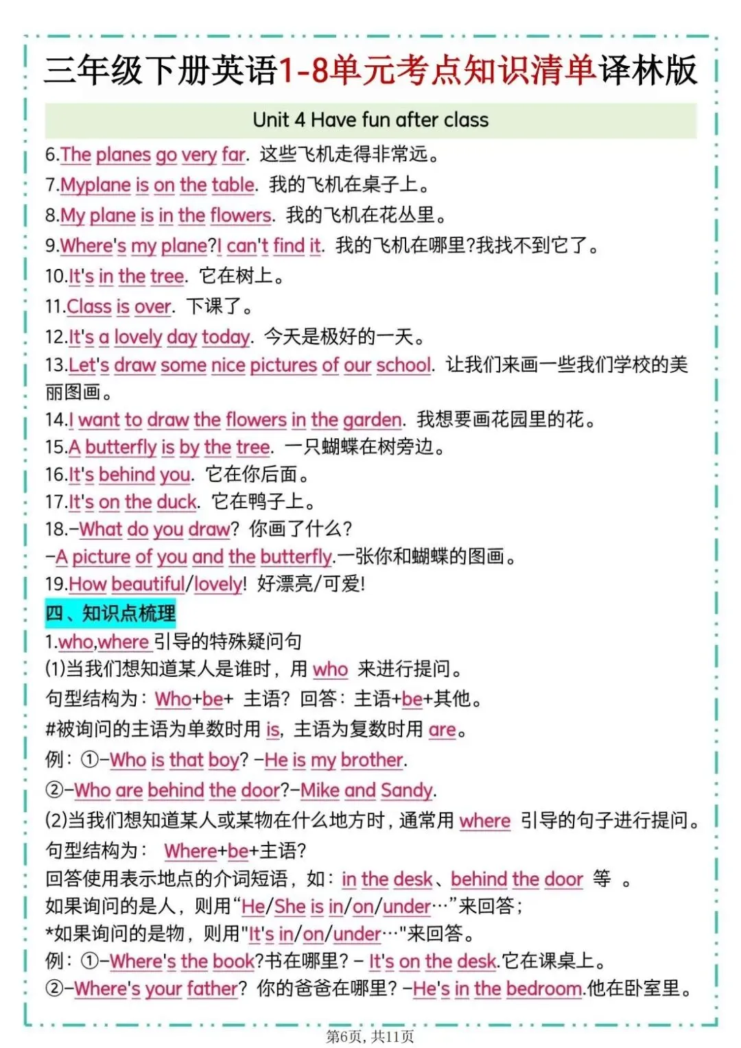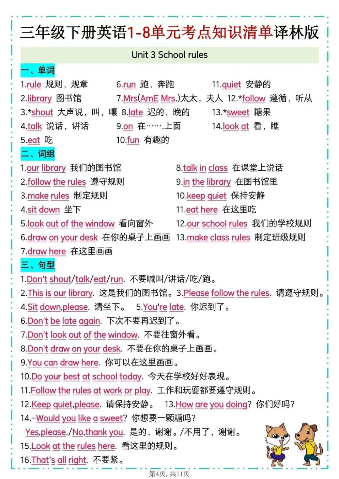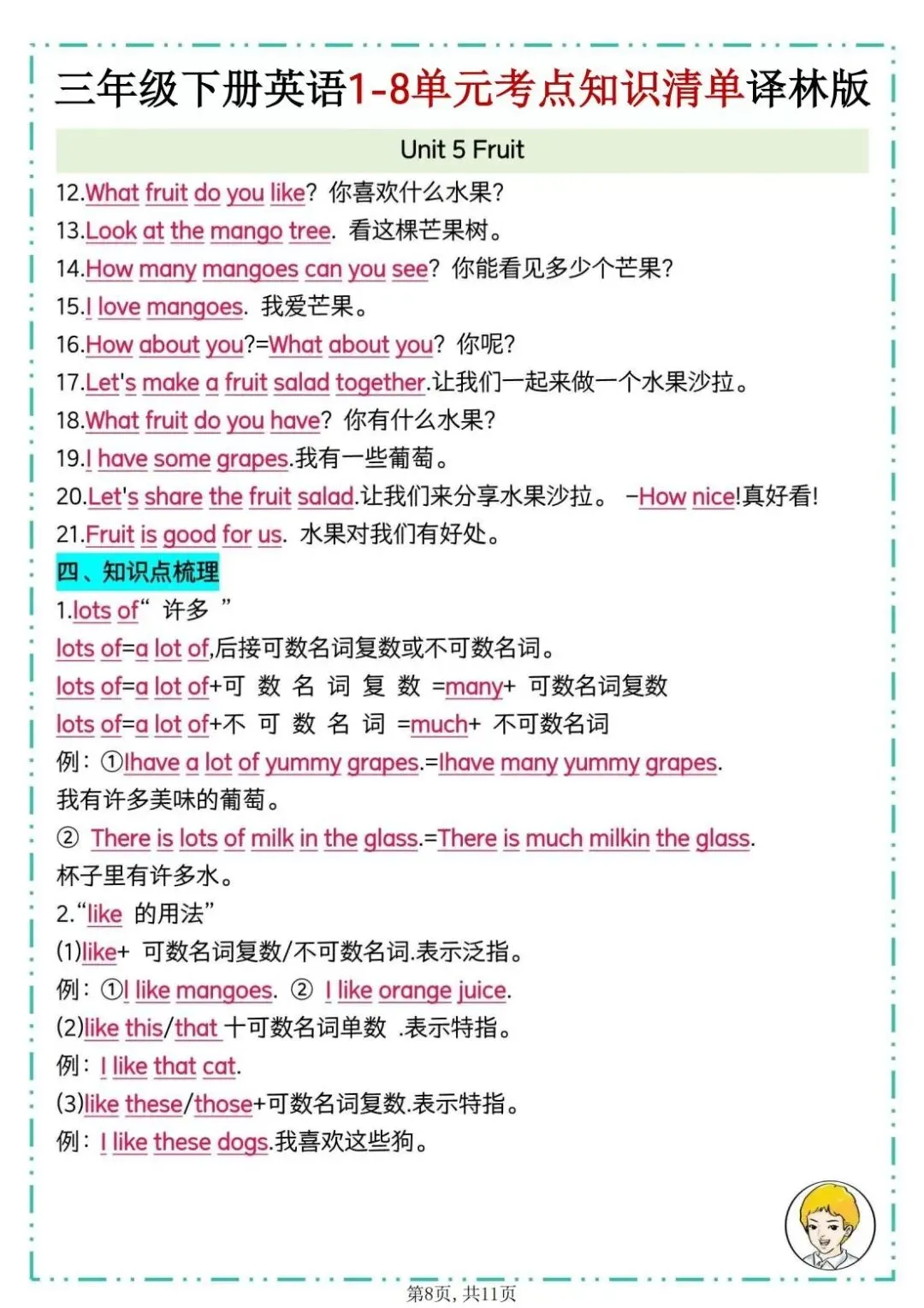 26春译林版三年级下册英语《1-8单元考点知识清单》,共11页,可打印