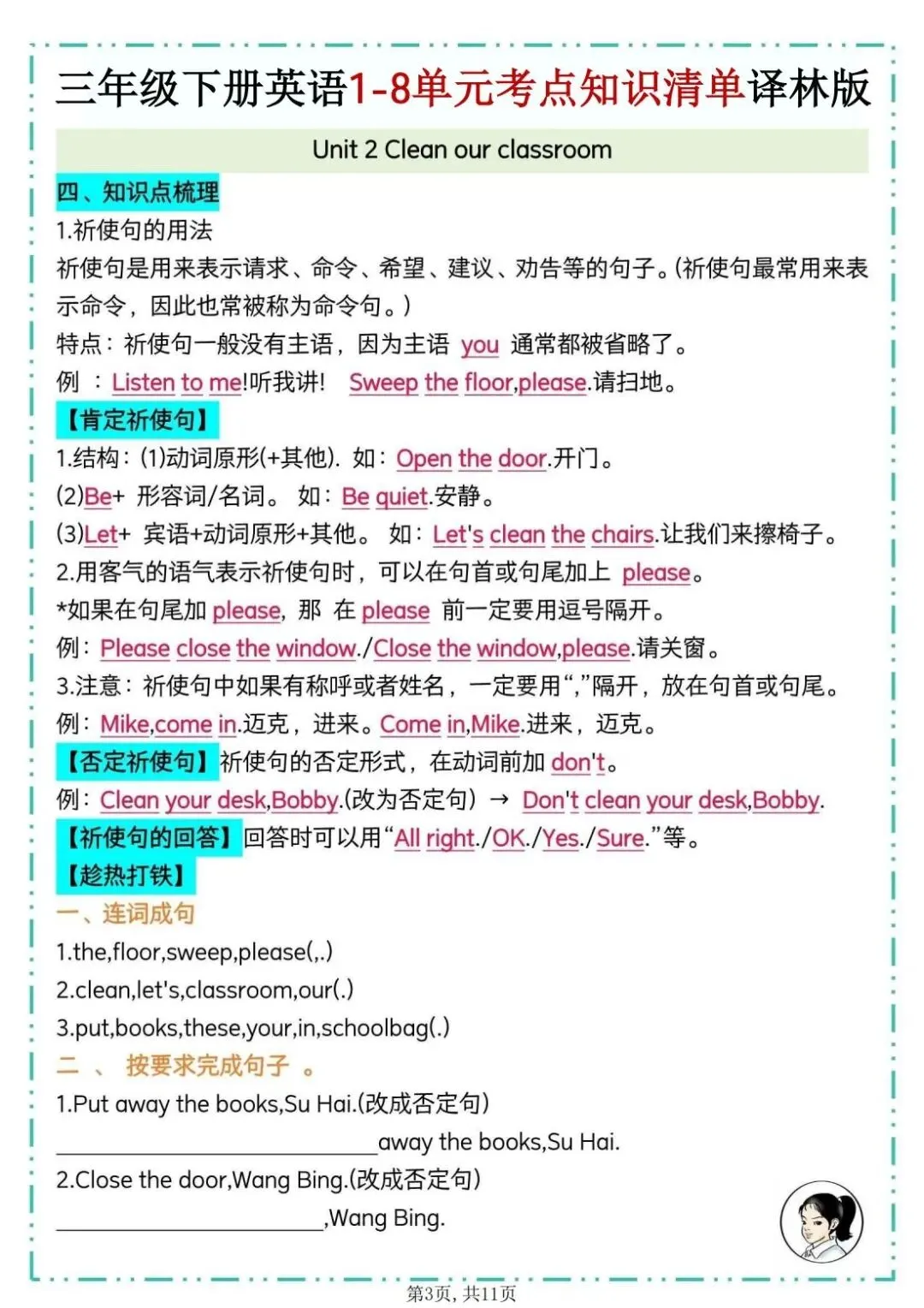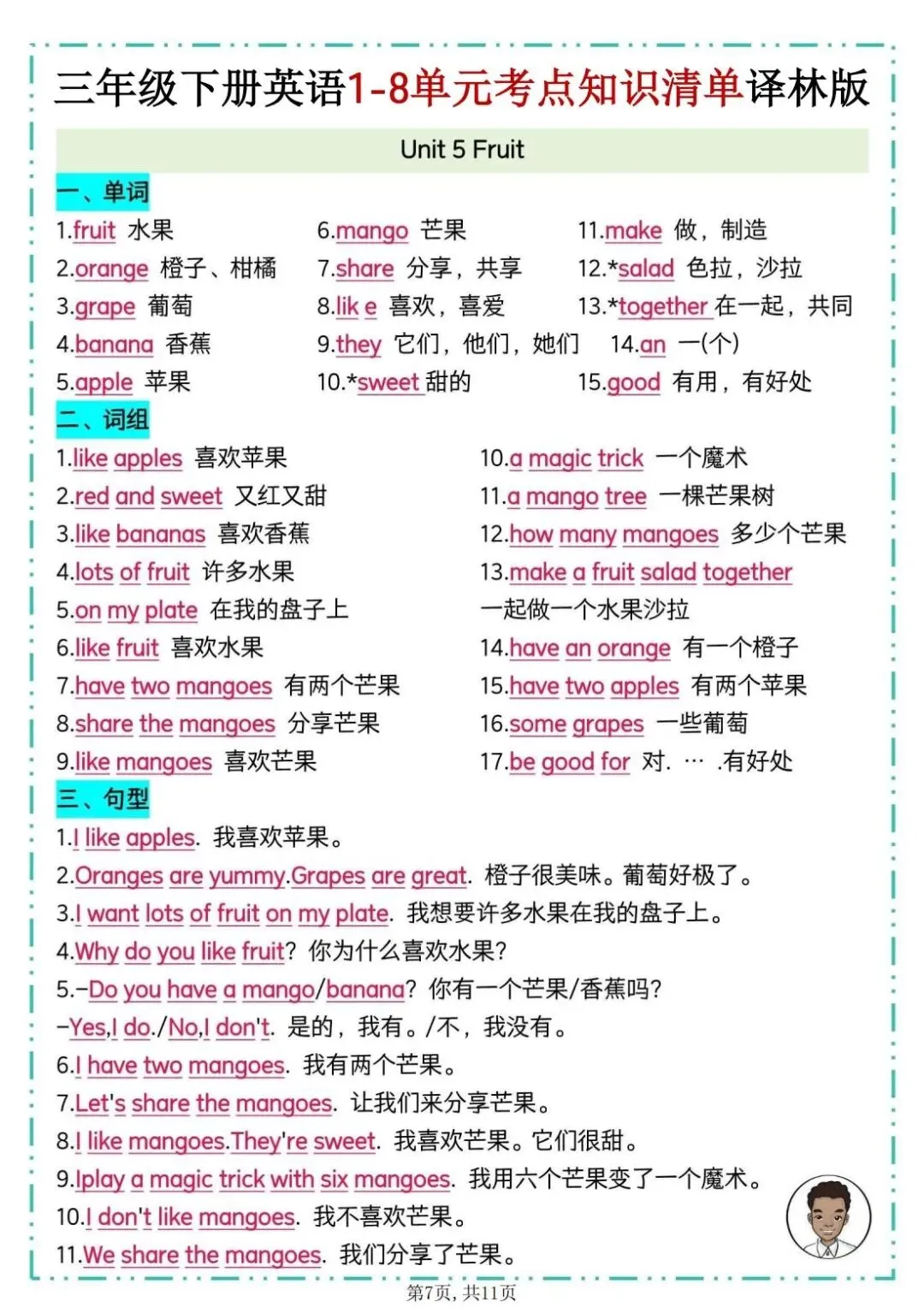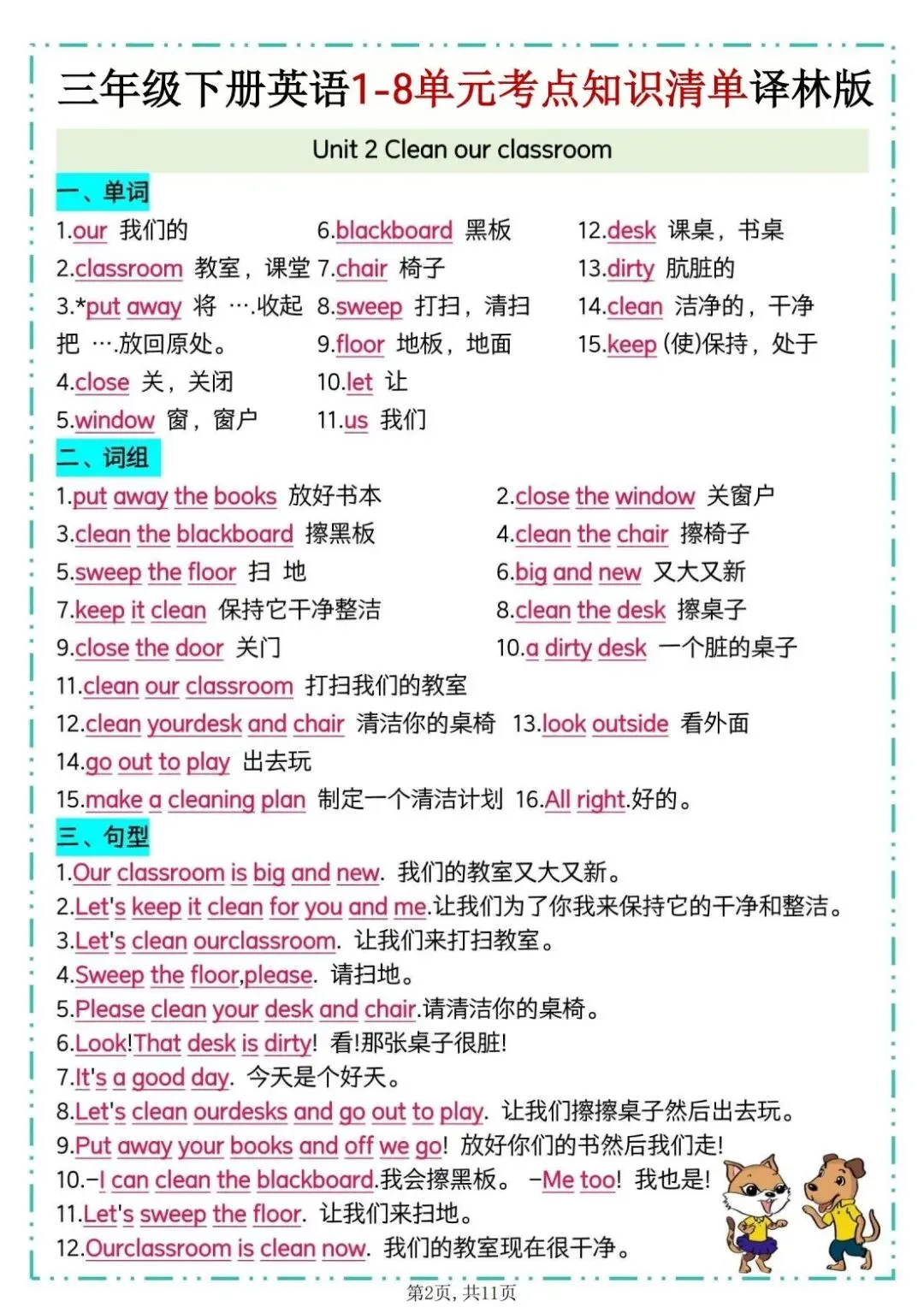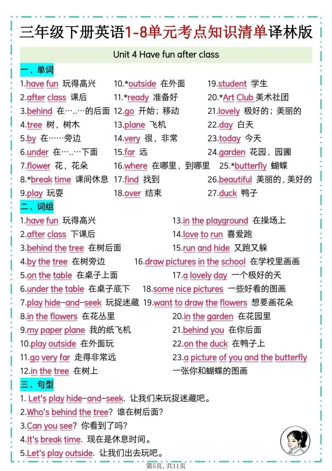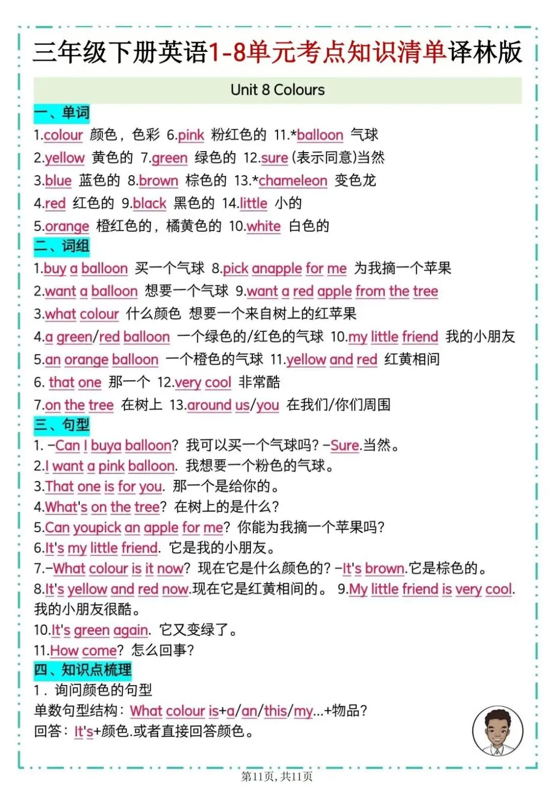 26春译林版三年级下册英语《1-8单元考点知识清单》,共11页,电子版可打印。该清单包含单词、重点词组、重点句型、知识点梳理及拓展延伸等必备知识点。帮助孩子巩固所学知识点,查缺补漏,提升学习成绩。有需要的家长快打印给孩子练一练。