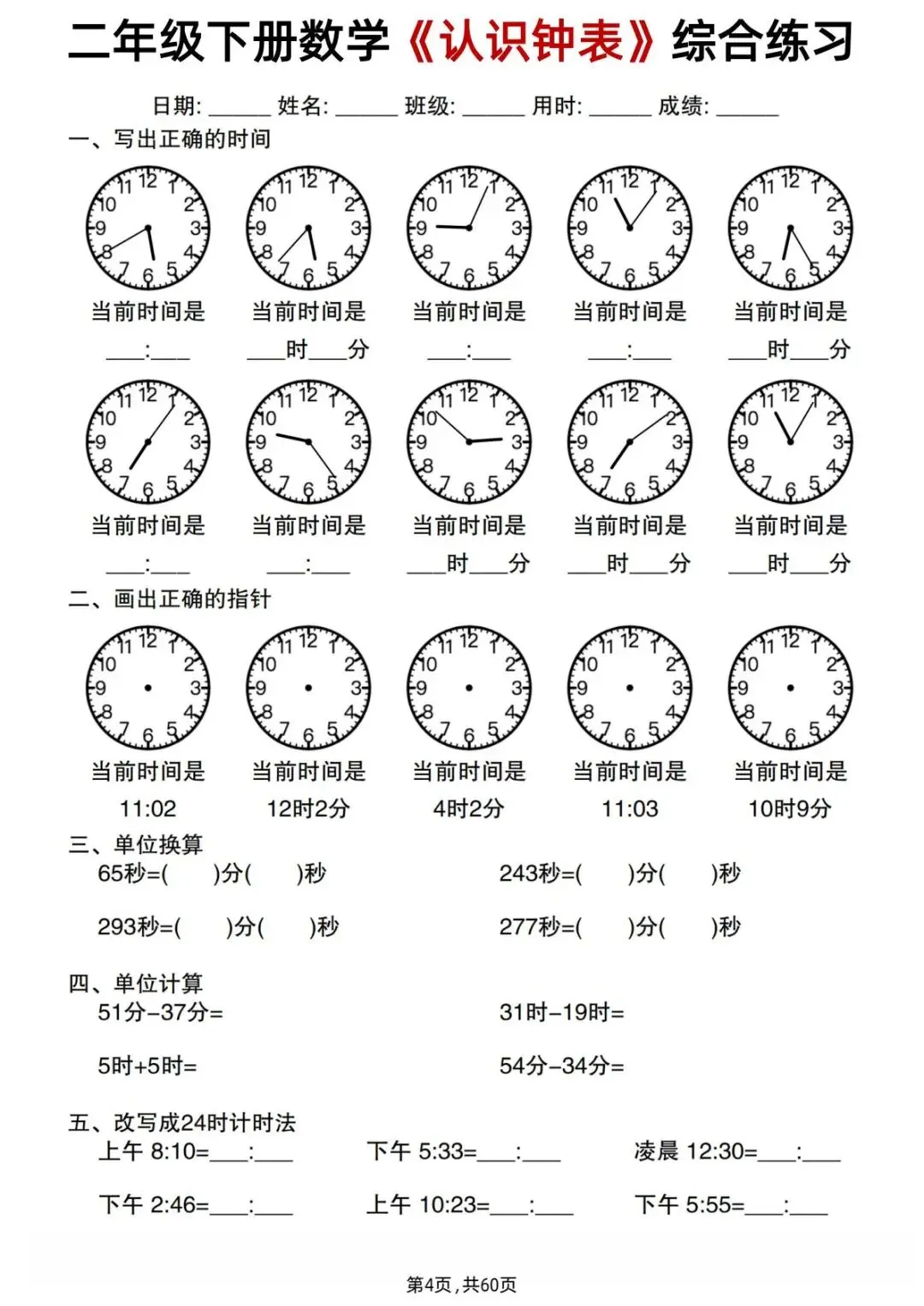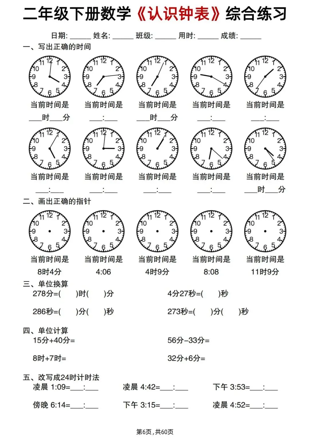 今天给大家分享的是:二年级(下)数学 《认识钟表》综合练习,共60页,电子版可下载打印。文章末尾可直接领取全套电子版,无套路,欢迎收藏和下载。如果觉得这份资料不错,建议分享到班级群/年级群,让其他家长打印出来,帮助孩子学习;如果觉得合适,请支持正版!