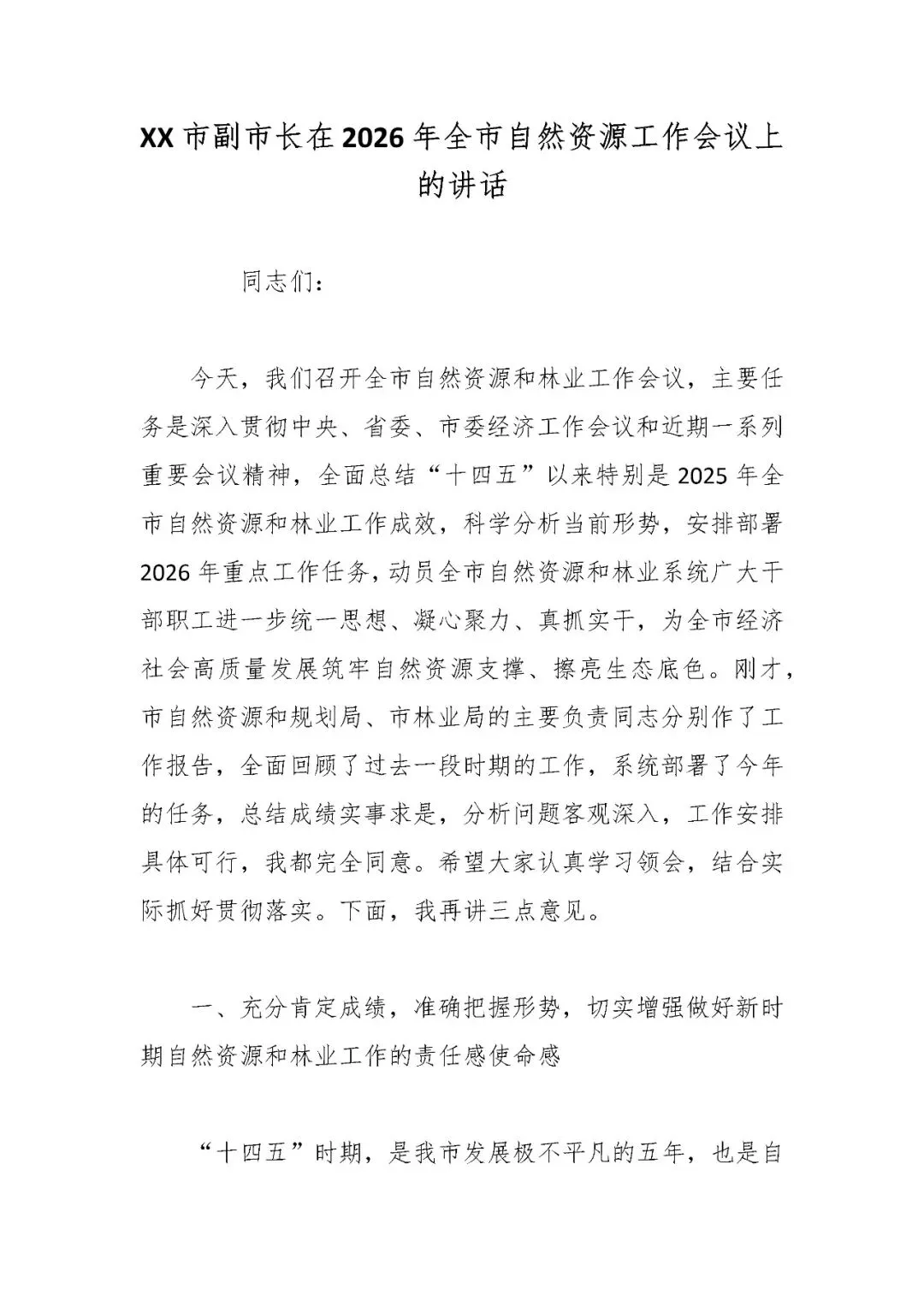 XX市副市长在2026年全市自然资源工作会议上的讲话