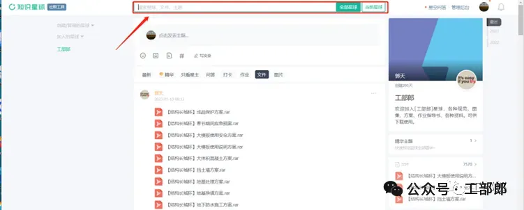 2、进入知识星球主页,页面顶部搜索栏可搜索关键词查找资料