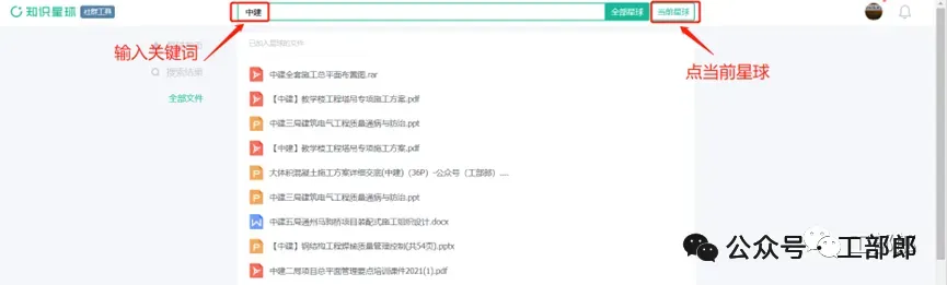 比如搜索【中建】相关资料,在顶部搜索栏输入【中建】,点击当前星球
