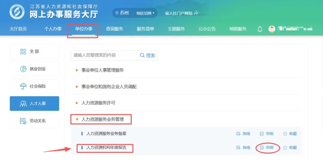 (单位办事——人力资源服务业务管理——人力资源机构年度报告——申报)