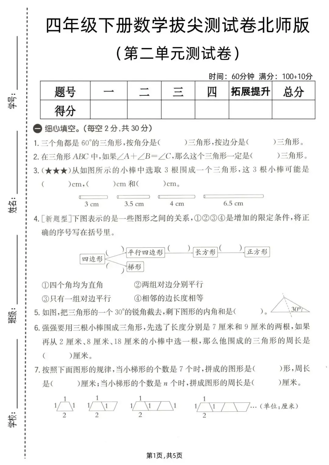 这份《四年级(下)数学第二单元拔尖测试卷《北师版》》有电子版可打印,方便又实用,可随时打印,无论是作为日常练习,还是课前预习、课后练习,都非常合适。清晰的排版、规范的题目设置,能有效引导孩子养成良好的学习习惯,可以给孩子打印,练一练!👍限时公益资料+公益学习动画,看文末可以自行领取👍