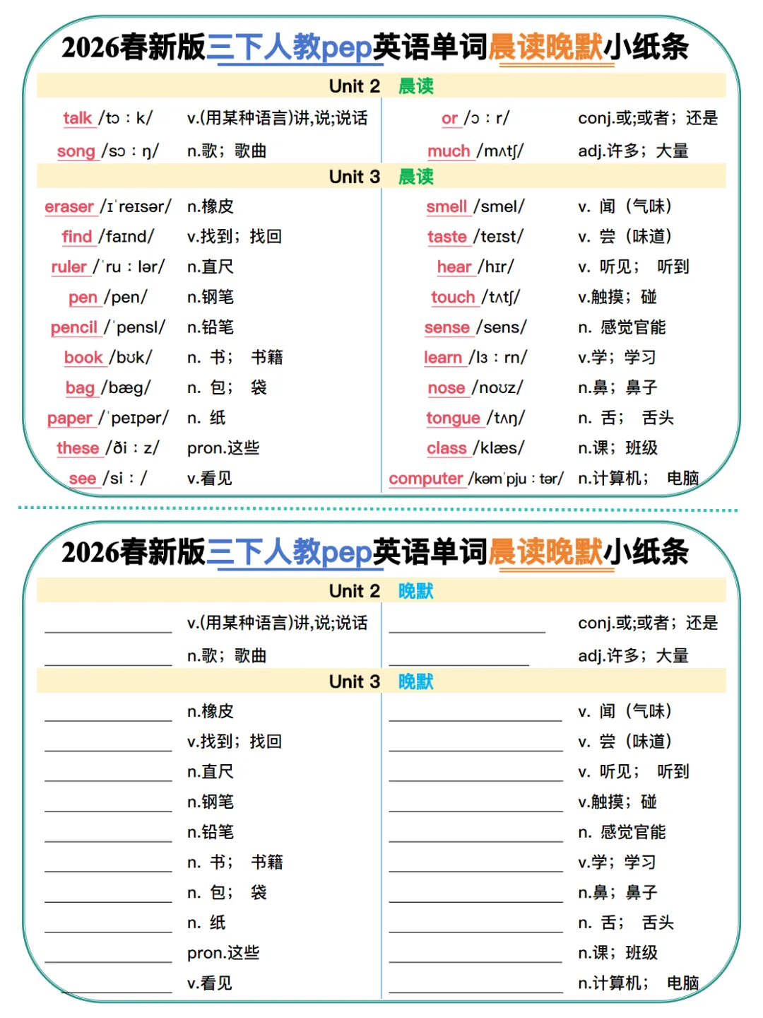 【免费下载】三年级(下)英语 2026春晨读晚默小纸条《人教版》,PDF电子版,可打印