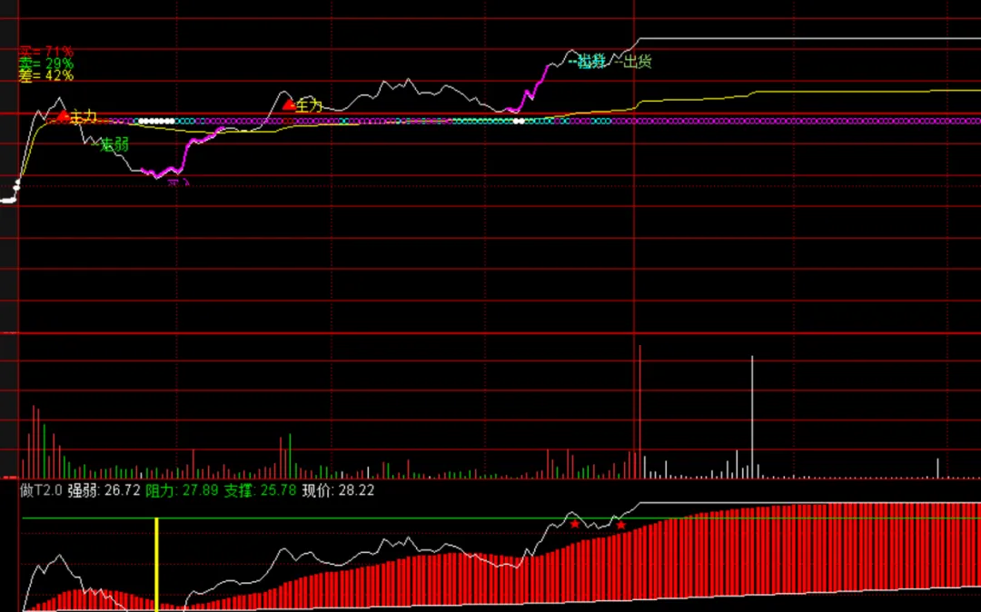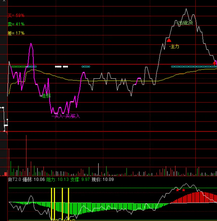 DRAWTEXT(LONGCROSS(现价,阻力,2),现价,’★’),COLORRED;{抛};