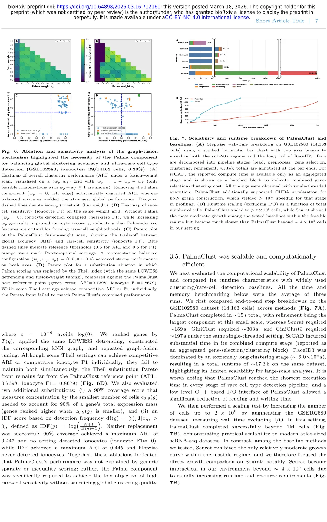 其次,从方法设计来看,PalmaClust的多图融合框架其实是整合多尺度信息的经典思路,但这里用得非常巧妙:不同特征指标捕捉不同类型的生物学变异,Palma负责抓超稀有信号,Gini和Fano负责维持全局结构,融合之后既不会因为只关注稀有信号失去全局稳定性,也不会因为只保留全局结构漏掉稀有信号,这种设计平衡了灵敏度和特异性,比单纯只做稀有检测的方法适用性更广。