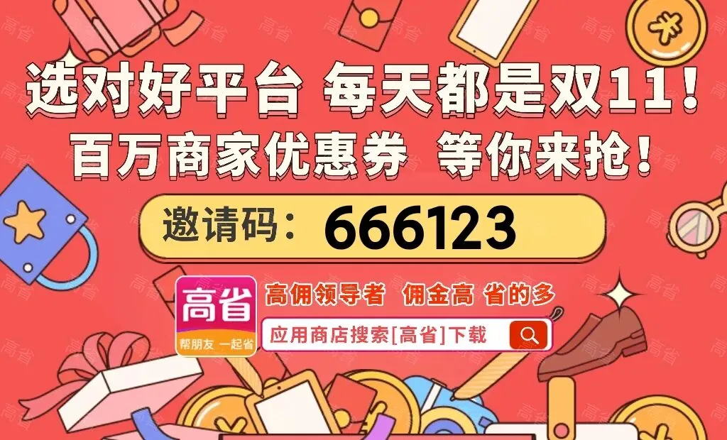【高省】APP(高佣金领导者)是一个自用省钱佣金高,分享推广赚钱多的平台,2000万用户信赖的四年老平台,稳定可靠。高省APP佣金更高,模式更好,终端用户不流失。高省是公认的返利最高的软件。金珊导师高省邀请码666123,注册送2皇冠会员,送万元推广大礼包,教你如何1年做到百万团队。