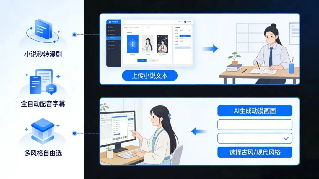 – 小说→漫剧“秒转换”:上传小说文本、剧本脚本,AI自动拆解剧情、匹配动漫风画面,分镜、转场、人物形象全搞定,不用手动设计!