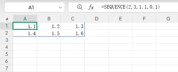 下面的例子,以1.1开始,每次增加0.1,得到一个2行3列的数组。