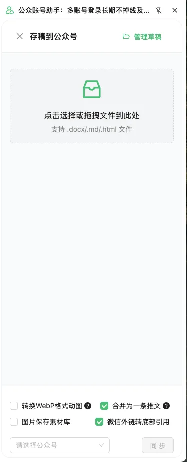 这样如果您使用AI软件工具批量写稿,一般可生成docx、markdown、html文档,稿件写好后,通过扩展可以批量将本地稿件同步到公众号草稿箱。