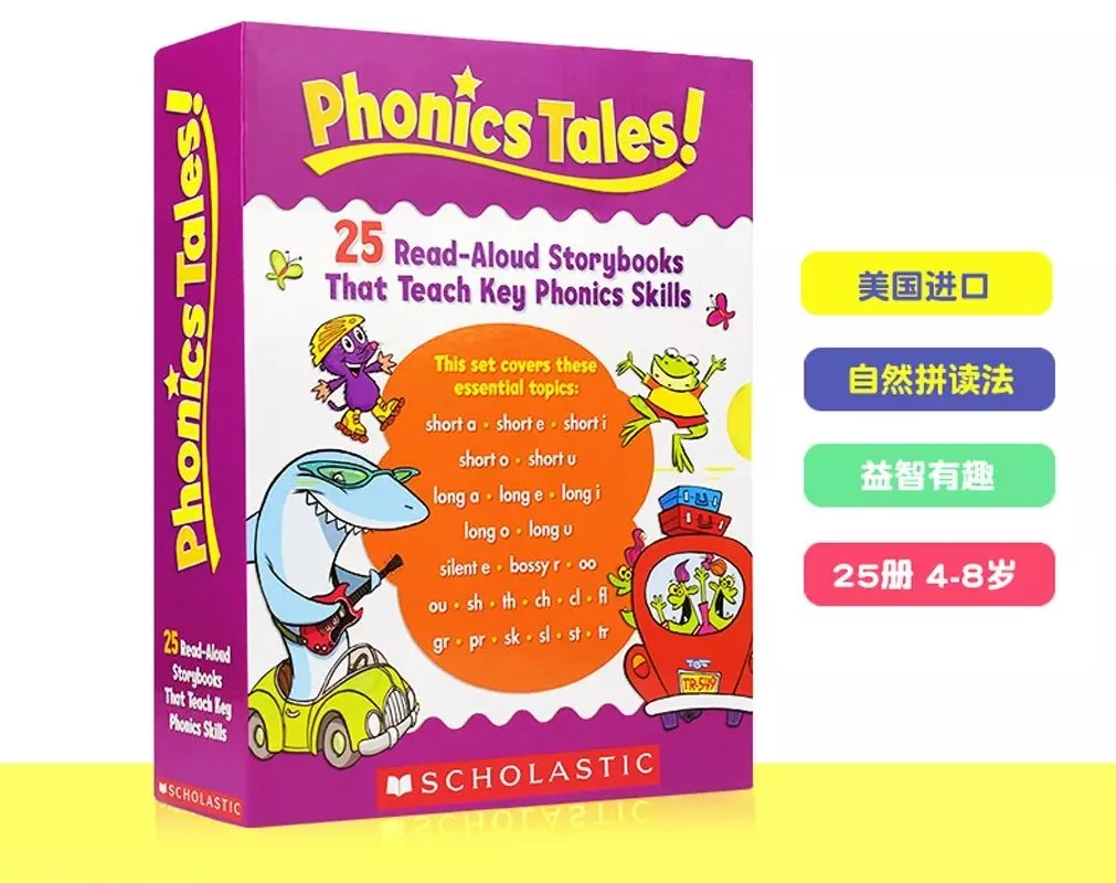 Phonics Tales自然拼读主题故事书,一共25本。用25个有趣的故事,帮助小朋友们学习自然拼读发音规则、积累词汇。每本书讲解一个发音规则,主要是两类: