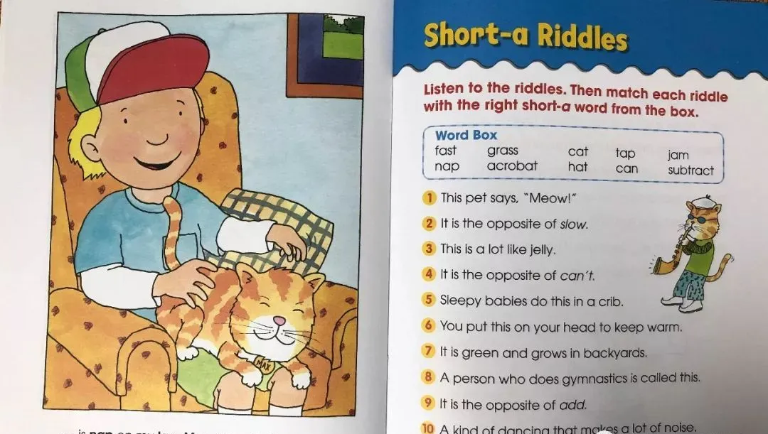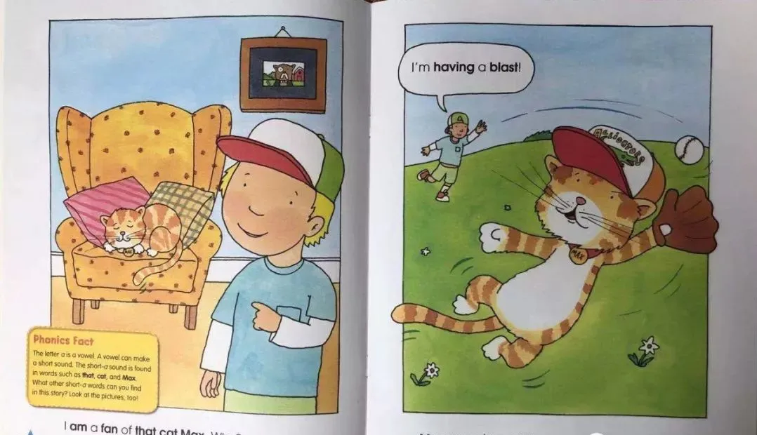 首先,拿到书,家长不用着急强调封面上的字母a的发音规则,这会让孩子觉得无趣。我们可以先带孩子读图,“Look at the cover,a boy and a cat!oh,the cat’s name is Max!”