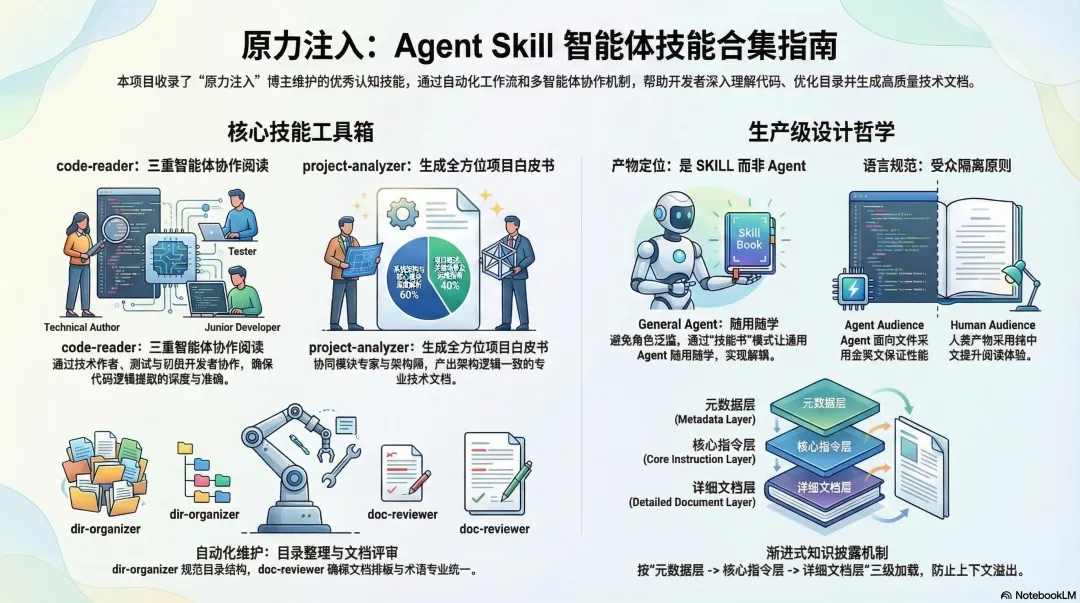本项目收录了由“原力注入博主”使用和维护的优秀认知技能。这些技能旨在通过自动化的工作流和多智能体协作机制,帮助开发者深入理解代码库结构、提取核心业务逻辑并生成结构化的技术文档。