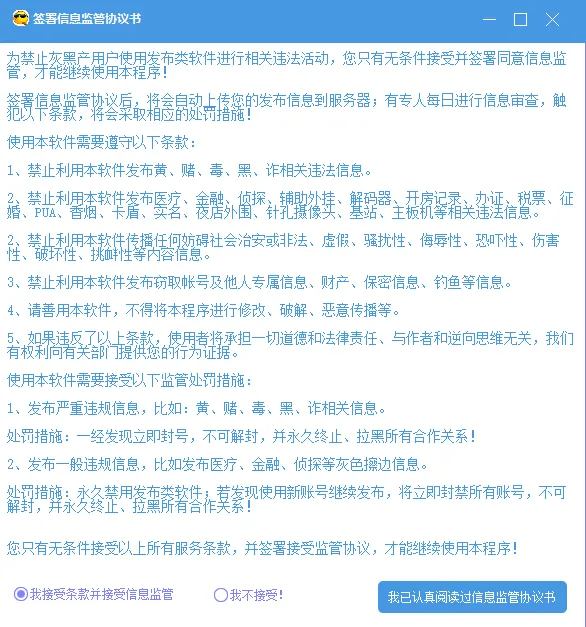 因此使用发布类工具必须签署【信息监管协议书】,接收相关信息监管条款,如下图所示: