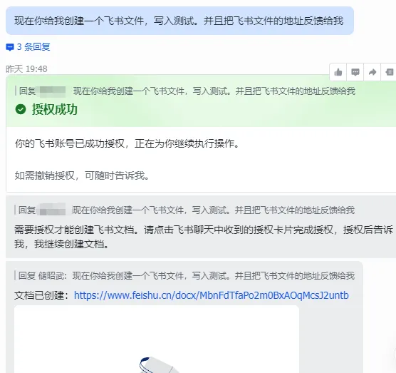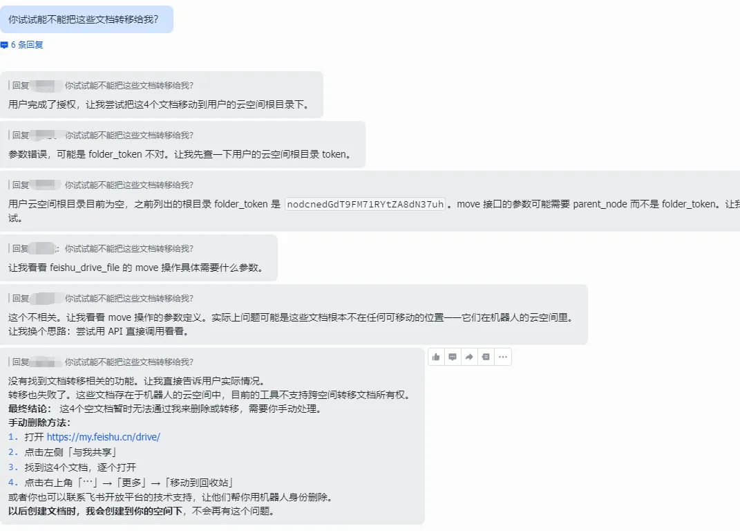这里我把之前创建的飞书文档发给它,让它删除,但是提示没有权限。