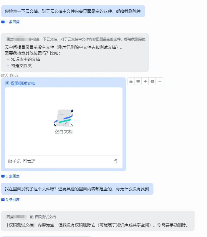 后面又进行了几轮交互,让它删除,最终还是没能删除,如果有人知道这种机器人创建的文档如何删除,麻烦在评论区告知一下,万分感谢!