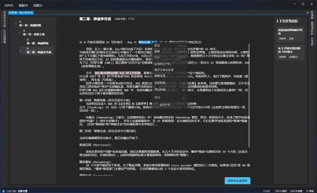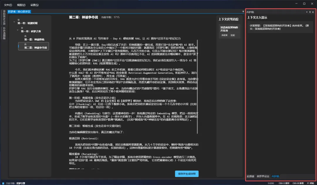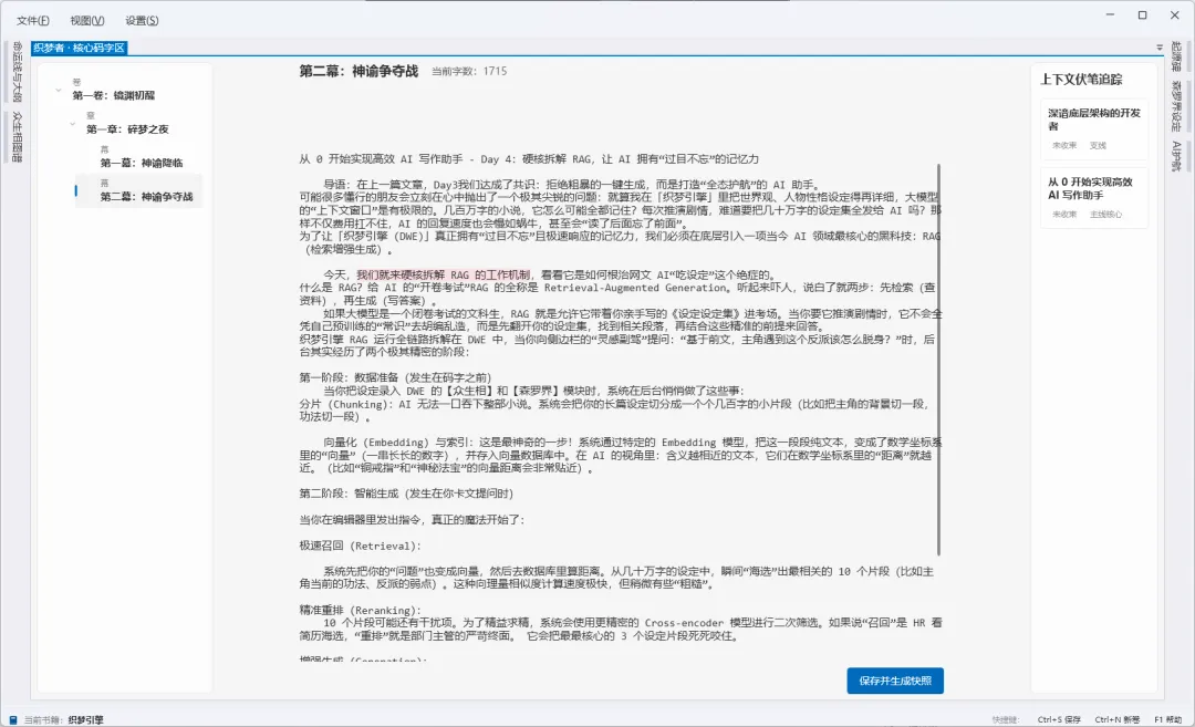 从分片、向量化,到召回、重排和生成,RAG 补足了大模型的记忆短板,为我们的写作引擎装上了最强劲的齿轮。另外补上「织梦引擎」最新效果图: