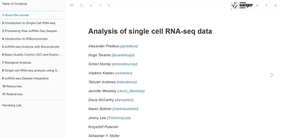 这门课程被许多人称为“保姆级”入门教程,它系统性地覆盖了scRNA-seq的全部分析流程。课程从最基础的原理讲起,逐步深入到数据预处理、降维聚类、细胞注释和数据整合等高级主题,共包含11个模块。它的最大优点是手把手教学。课程基于R/Bioconductor生态,专门教你使用SingleCellExperiment这一核心数据结构。第八章还详细对比并讲解了当前主流的Seurat分析流程。即使你完全没有编程基础,也能跟着课程搭建起完整的知识框架。此外,课程网站提供了配套的公开数据集和所有R代码脚本,真正做到“学完即能上手操作”。
