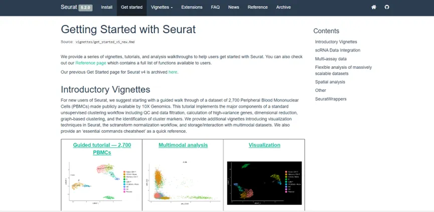 Seurat是scRNA-seq分析领域使用最广泛的R工具包。其官方教程是绝佳的实战练兵场。教程以经典的“2700个PBMC(外周血单个核细胞)数据集”为例,一步步演示了质量控制、高可变基因筛选、主成分分析、细胞聚类和标记基因鉴定等标准流程。随着技术发展,Seurat教程也涵盖了多模态数据整合,例如将单细胞数据与空间转录组数据结合分析。对于新手,网站提供的“常用命令速查表”非常实用,你可以随时查阅,无需死记硬背代码。