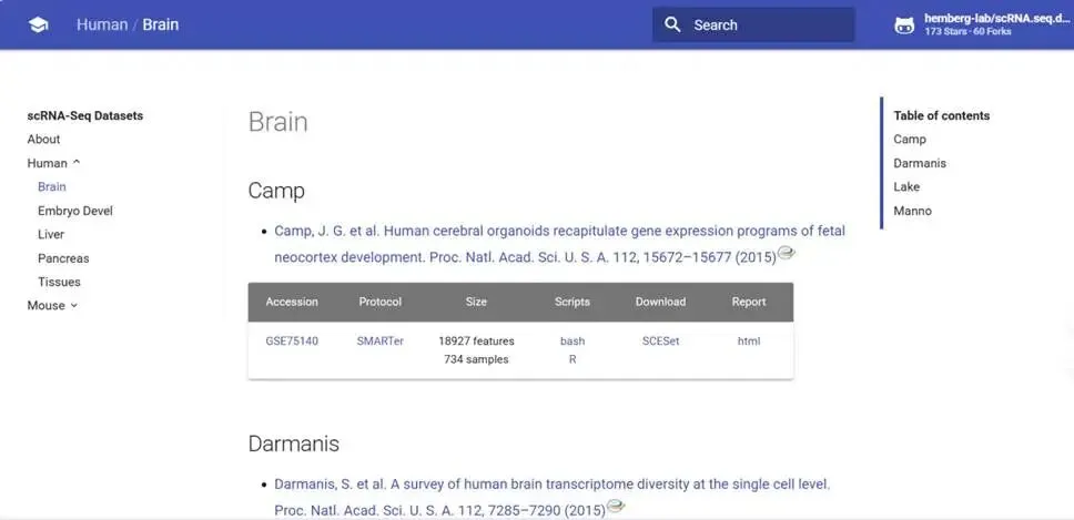 当你苦于没有合适的练习数据时,这个数据库就是你的救星。它系统地收集了已发表的scRNA-seq数据集,并按物种(人、小鼠等)和组织(大脑、肝脏、胰腺等)进行了分类。例如,你可以轻松找到“Camp”数据集,它来源于人脑类器官研究。每个数据集都提供了原始数据编号、实验方法和预处理说明,很多数据甚至直接提供了SCESet或SingleCellExperiment 格式的文件,为你省去了繁琐的数据下载与格式转换步骤。