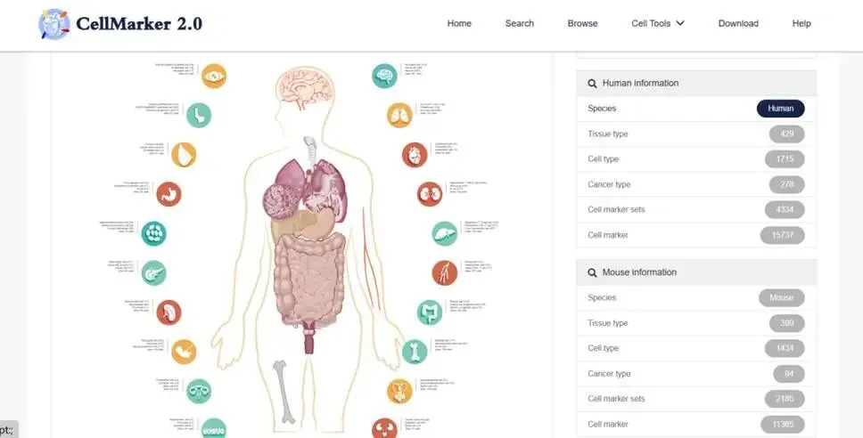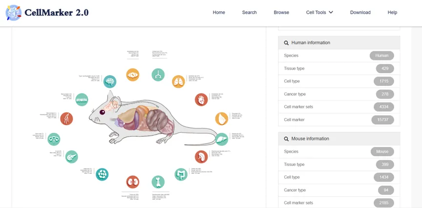 这个数据库收录了极为全面的信息,涵盖人和小鼠的超过1000种细胞类型和1.5万个标记基因。你可以通过“组织-细胞类型”的层级结构进行精准搜索。比如,你想鉴定大脑中的星形胶质细胞,直接搜索即可获得相关的高置信度标记基因列表。