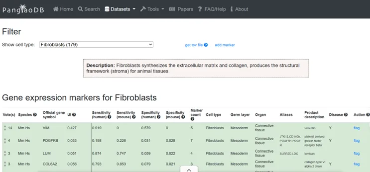 该数据库的特点是专注于高质量、高特异性的标记基因。它对收录的每个基因都进行了评估,并标注了其在特定细胞类型中的表达灵敏度和特异性。例如,当你查询成纤维细胞的标记时,它会突出显示VIM、PDGFRB这类经过广泛验证的经典基因,帮助你做出更可靠的判断。