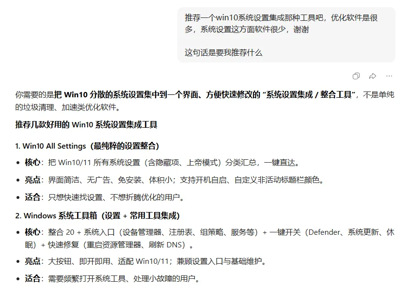 最近吐槽推荐的都比较频繁,接粉丝留言说要推荐一个win10工具设置,原话是这样的:“推荐一个win10系统设置集成那种工具吧,优化软件是很多,系统设置这方面软件很少,谢谢”