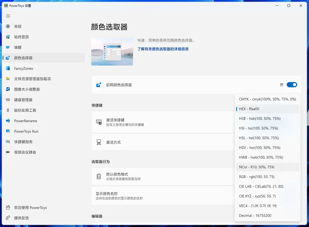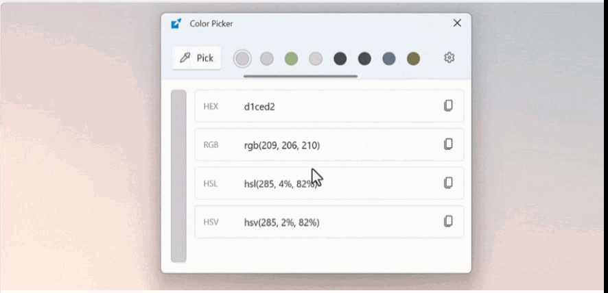 可以通过Win+Shift+C打开弹窗,出了调颜色外,可以在任何应用中吸取颜色值。颜色值会复制到剪贴板中。当然也有历史记录等功能。