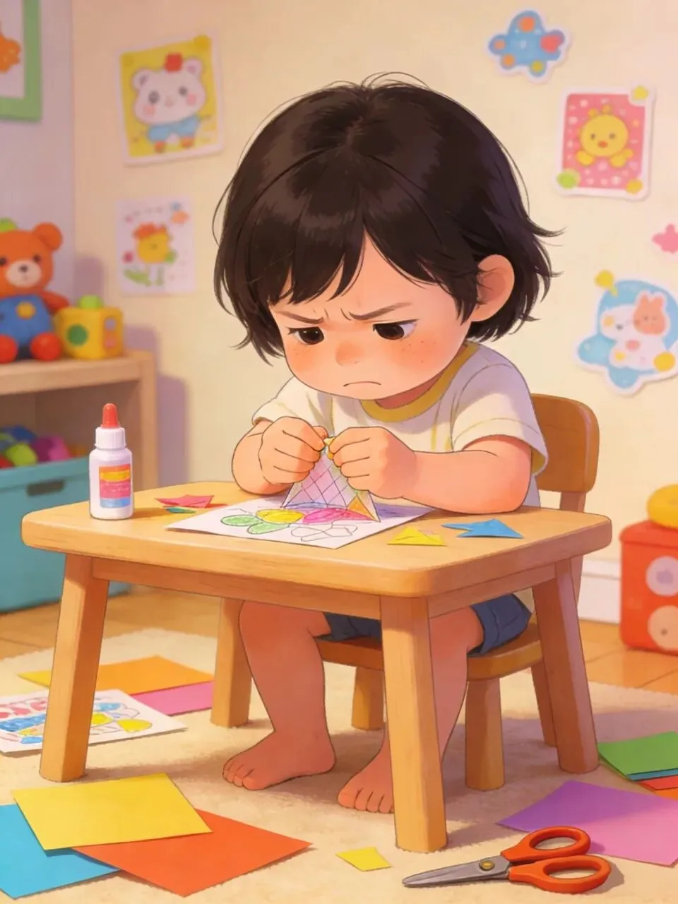 老师布置了一个稍微难一点的手工作业,孩子拿到手就皱眉头:“这个我肯定做不好。”