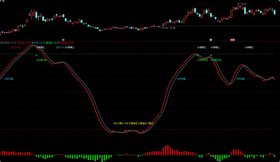 DRAWTEXT(CROSS(主力线, 65) AND 主力线>散户线, 60, ‘冲顶预警’), COLORLIBLUE;
