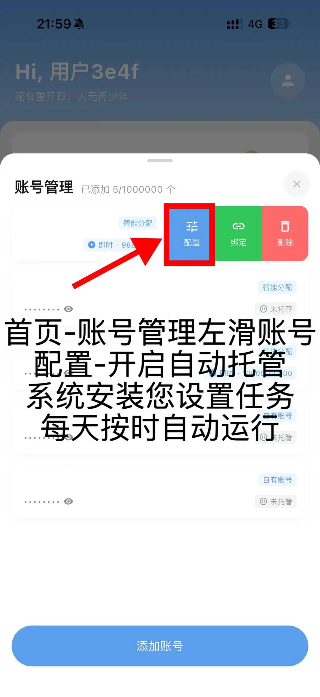 1. 回到账号管理列表,左滑目标账号,点击 配置