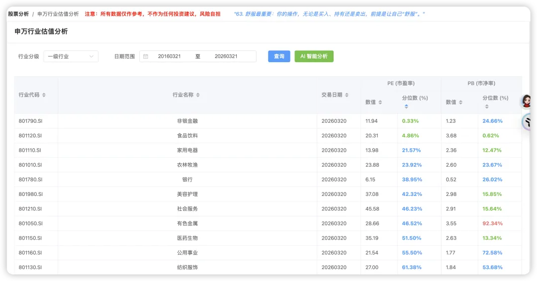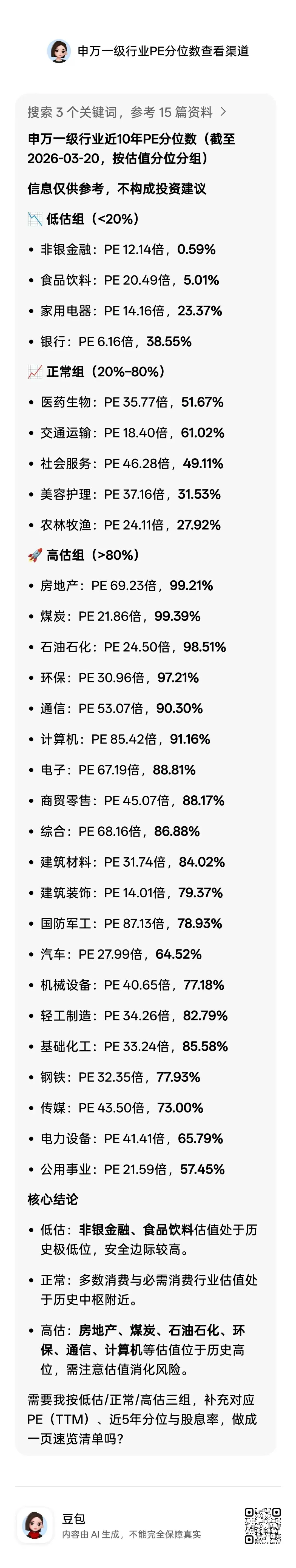 我对比了一下豆包和我平台的申万一级行业10年pe分位数,发现基本一致,这是因为豆包在该次回答中搜到了最新的信息。