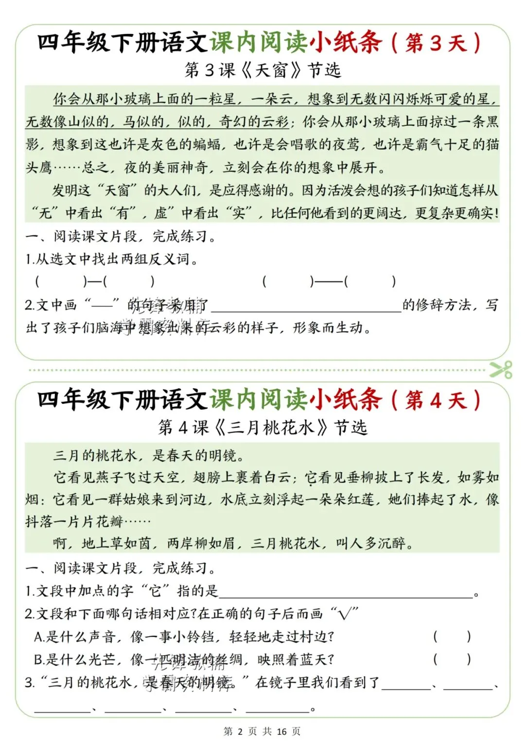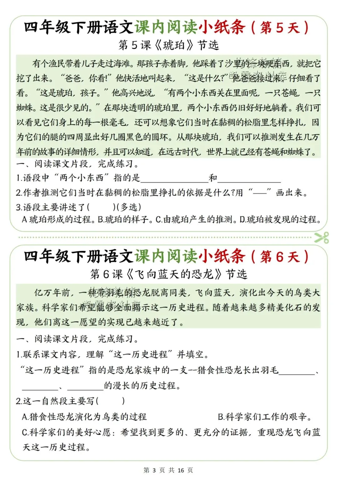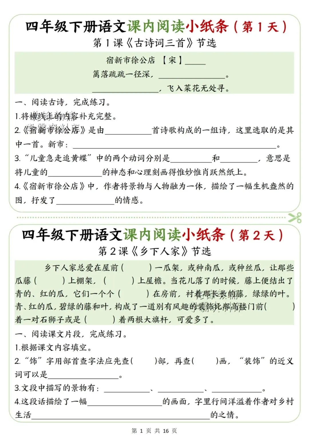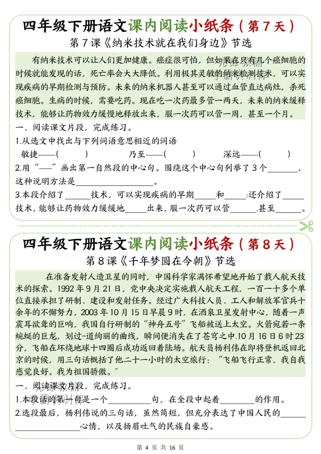 今日分享:四年级下册语文课内阅读小纸条PDF新鲜出炉!同步课本课文,聚焦段落赏析、中心概括、语句理解,题型贴合单元考点,可打印练习,每天练一页,课内阅读稳稳拿分。