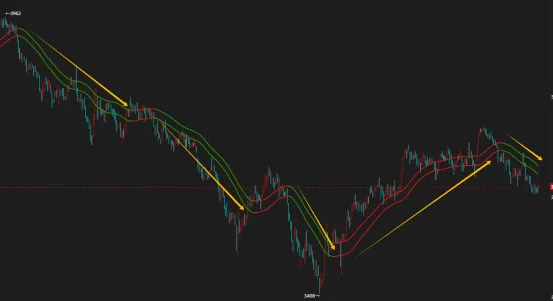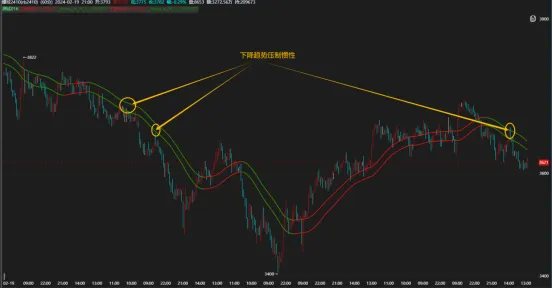 当市场呈现下降态势时,若市场价格反弹到黄金双通道附近,往往容易受到阻碍。具体而言,当趋势线呈现双绿色线条时,若市场价格反弹至双绿色线条附近,可考虑进行卖出操作,同时将止损位置设定在双绿色线条上方。