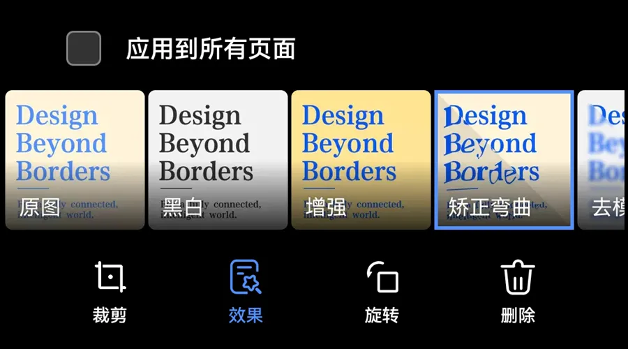 滤镜效果:点击下方的「滤镜」按钮(通常是一个魔法棒或三个圆圈的图标),选择「增强」或「黑白」模式,能让文字更清晰、去除背景阴影。推荐选择“黑白”或“增强”模式,效果最好。如文件没拍正,也可用「矫正弯曲」模式使页面平整。