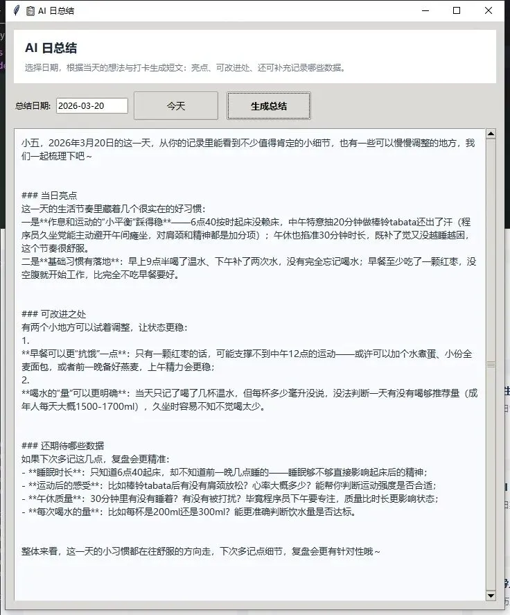 这个过程中,问了七八次ai。比如我想去玩壶铃减脂,他会根据我今天的习惯给个建议。中午想喝咖啡了,美式行不行,各种乱七八糟的!