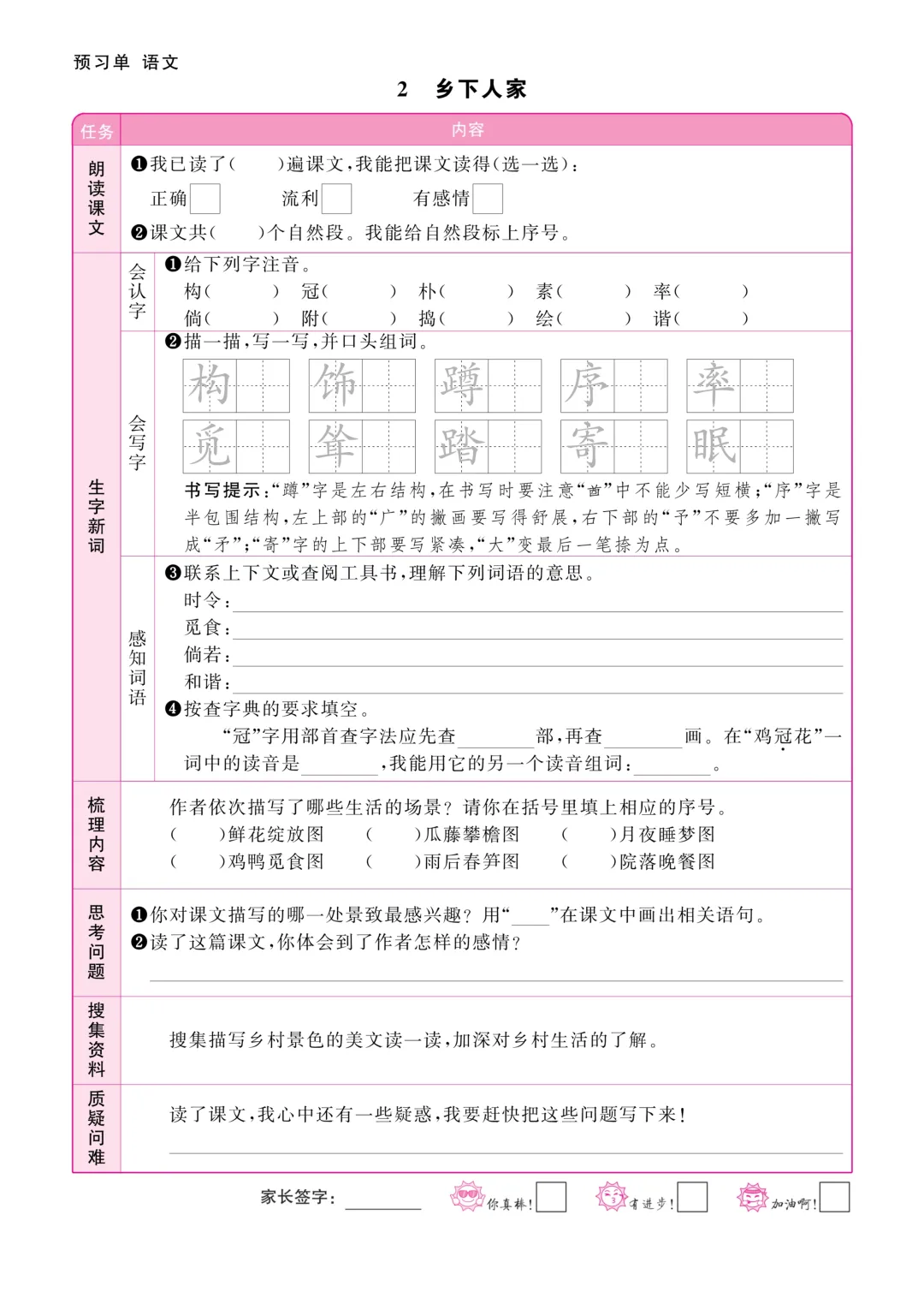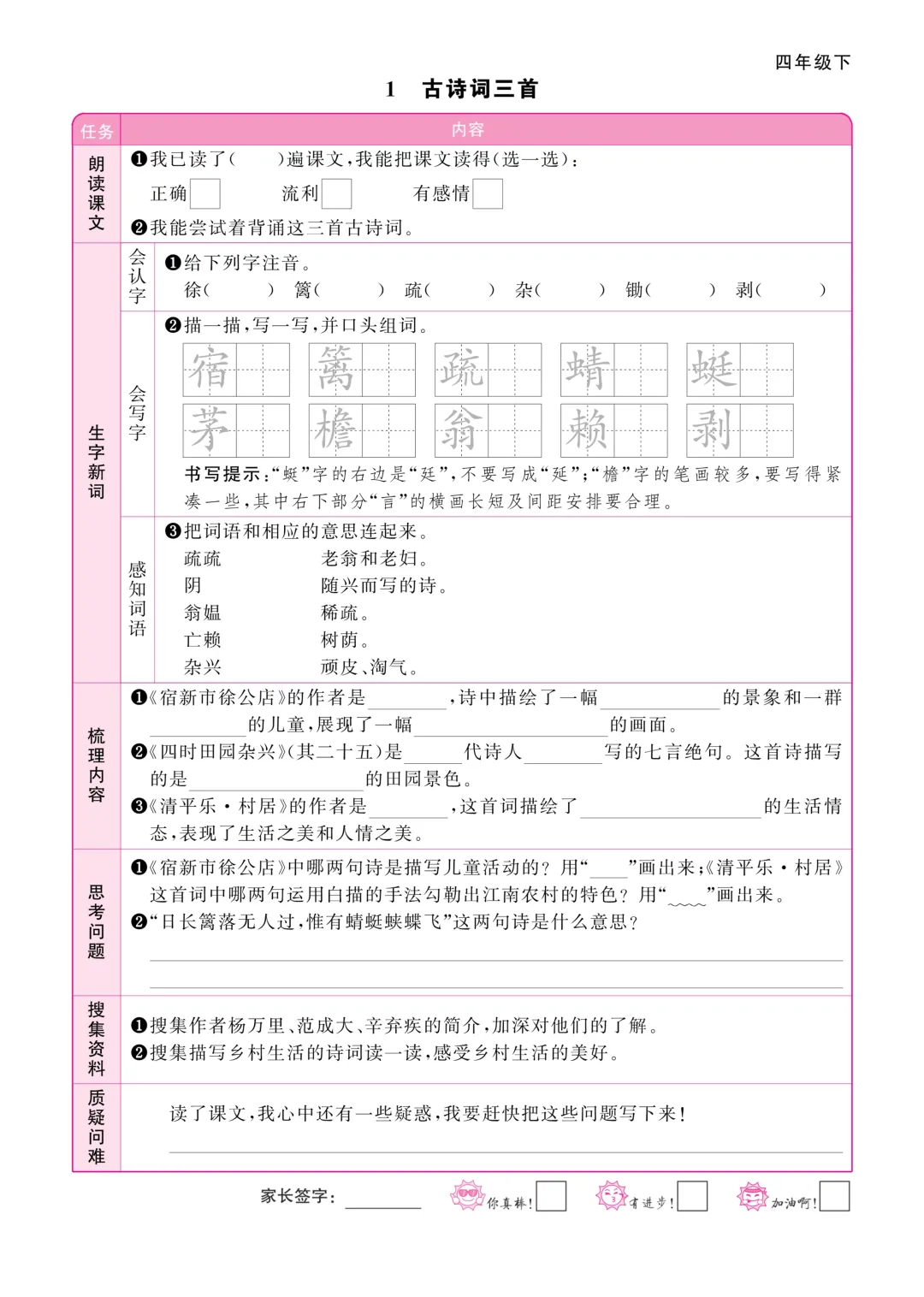 【免费资源】,四年级(下)语文 课前预习单,可打印,PDF电子版,保存后下载