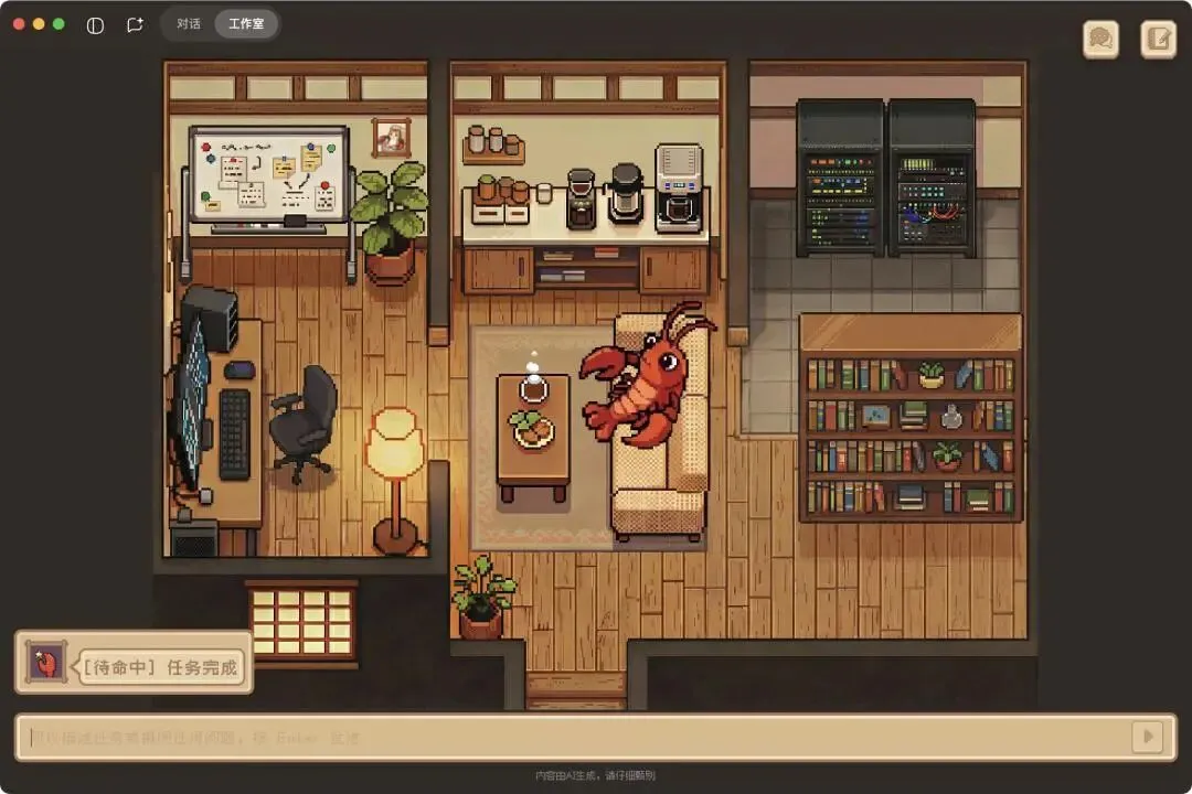 最魔性的是新增的「龙虾像素工作室」!AI干活时会蹦出一只像素风小龙虾🦞,举着小钳子帮你搬文件、写代码,甚至定时提醒你喝水!工作烦躁时看它扭来扭去,莫名解压…(同事以为我电脑中毒了哈哈哈)