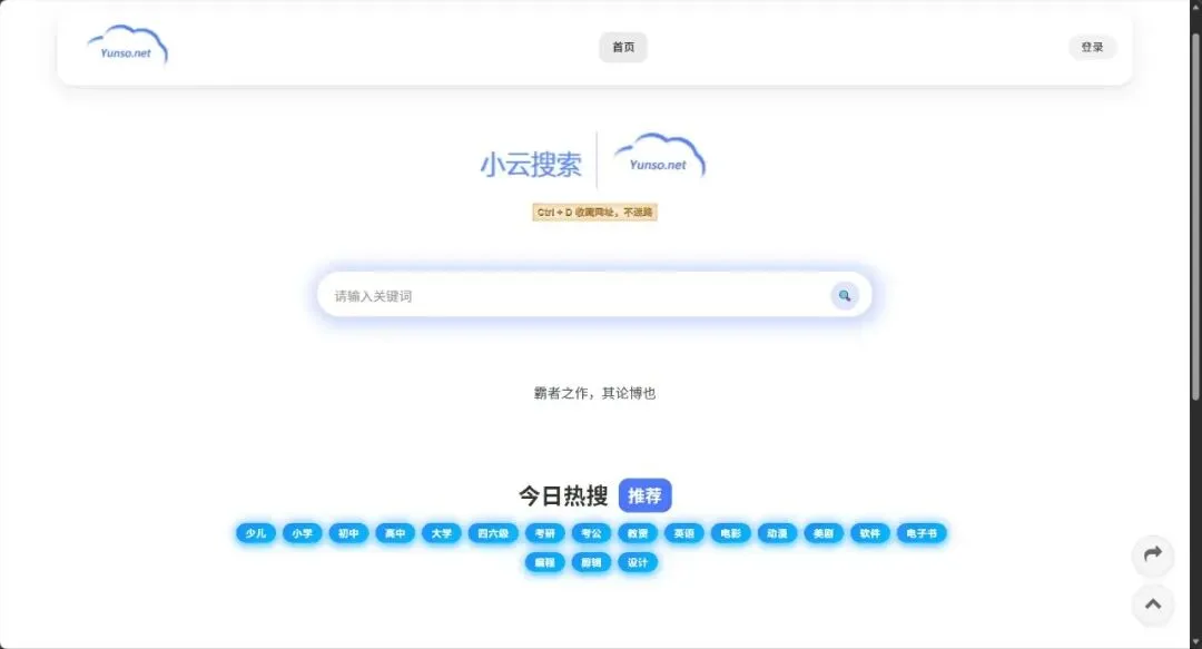 – 优势:界面简洁,热门资源标签直达,影视、学习资料一键检索