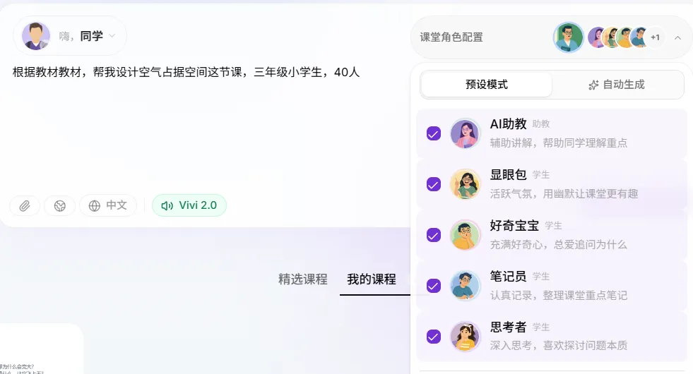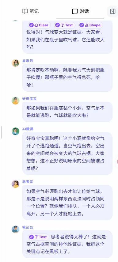 还能添加多个 AI 角色,模拟课堂里不同学生的参与。上课过程中有笔记、有讨论,自己也可以随时加入和 AI 角色讨论互动。