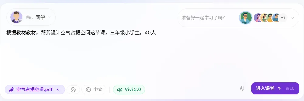 把教材里你要讲的那一节课截图或截取出来,另存为 PDF,上传进去,或者输入你的素材。
