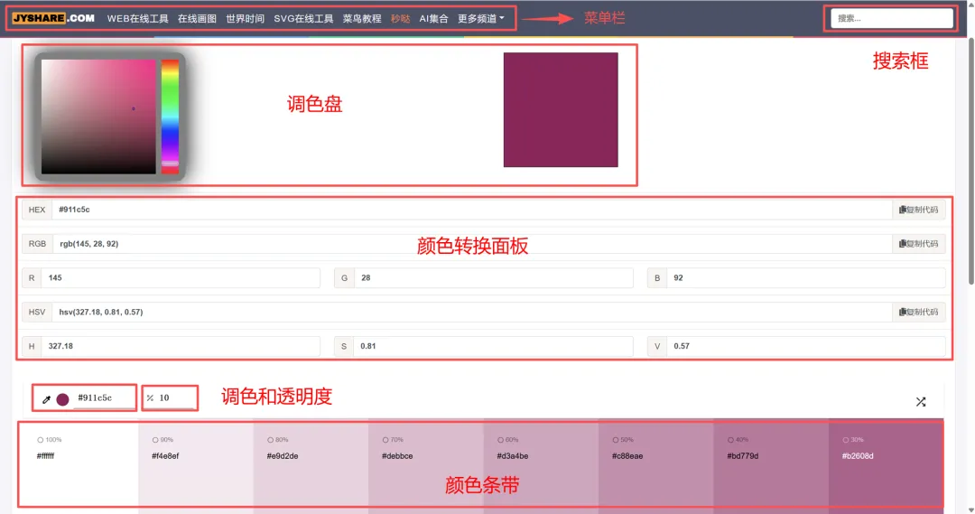从页面上看,该取色器大致可以分为菜单栏、搜索框、调色盘、颜色转换面板、调色和透明度、色带6个部分。