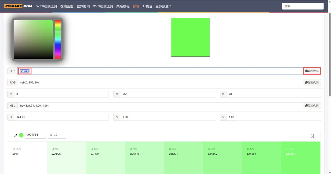 颜色模式支持HEX、RGB、HSV三种类型,点击颜色转换面板中的复制按钮或者直接选中颜色值进行复制。