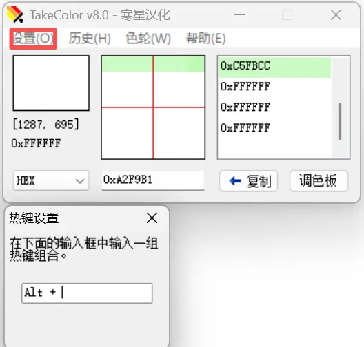 点击设置->热键设置,可以在下方面板中修改获取颜色快捷键。颜色吸取完成后,会在调色板中进行显示,点击复制按钮即可使用。