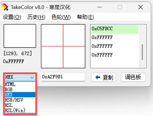 TakeColor取色器支持多种颜色模式,包括RGB、HEX、HSV、HSL等。