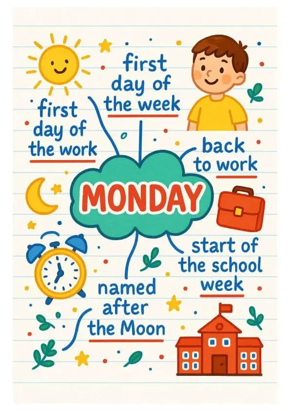 如Monday:关联 “月亮(Moon)” 的词源,搭配公文包、闹钟、学校的插画,直观传递 “一周工作、上学的开始”,孩子瞬间理解 “back to work”“start of the school week” 的场景。