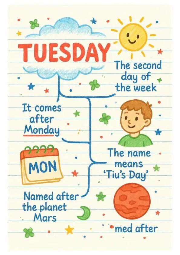 Tuesday:标注 “源自行星火星(Mars)意为‘Tiu’s Day,再用日历、卡通人物强化 “周一之后” 的顺序,词源 + 逻辑双管齐下。