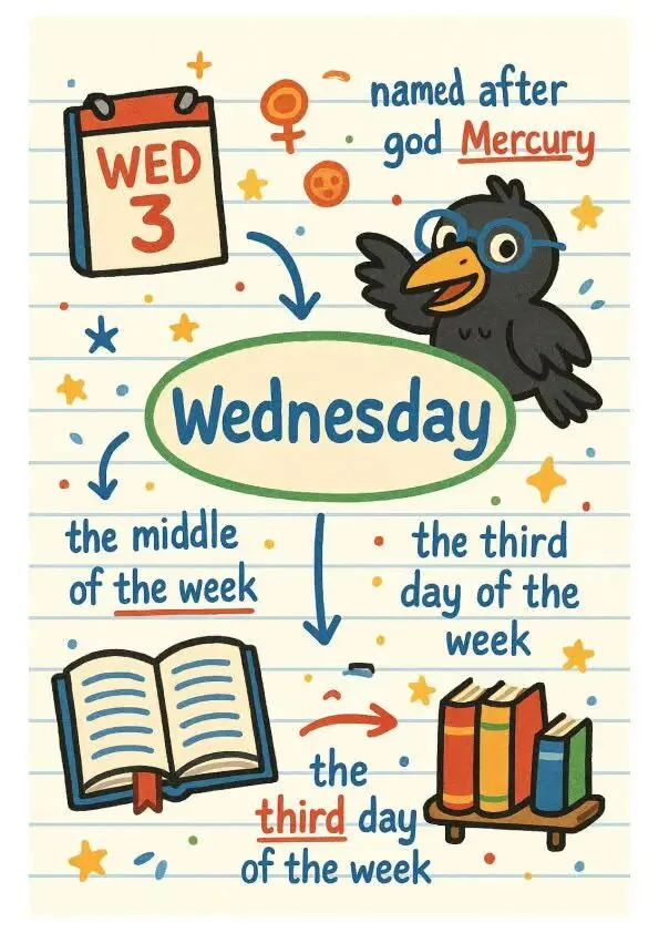 从 “乌鸦代表的 Wednesday(神 Mercury)” 到 “雷神 Thor 衍生的 Thursday”,每个星期几都有专属的视觉符号和文化背景,孩子记的不是孤立单词,而是 “画面 + 故事 + 逻辑” 的记忆链 。